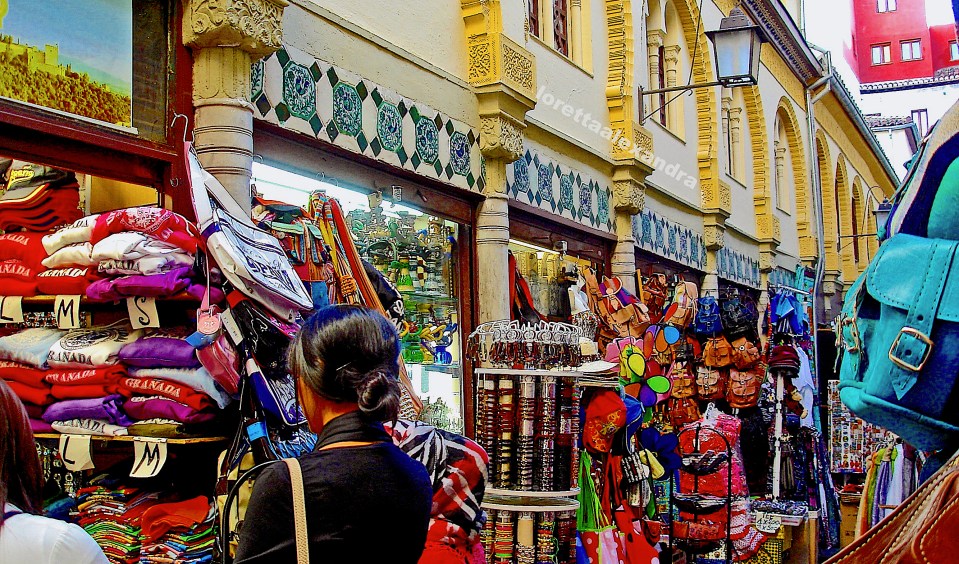The Alcaiceria, Granada’s vibrant and colorful Great Bazaar, is a series of shops and stalls selling mostly ethnic clothing, fabrics, crafts, souvenirs, fruit, and Moroccan spices